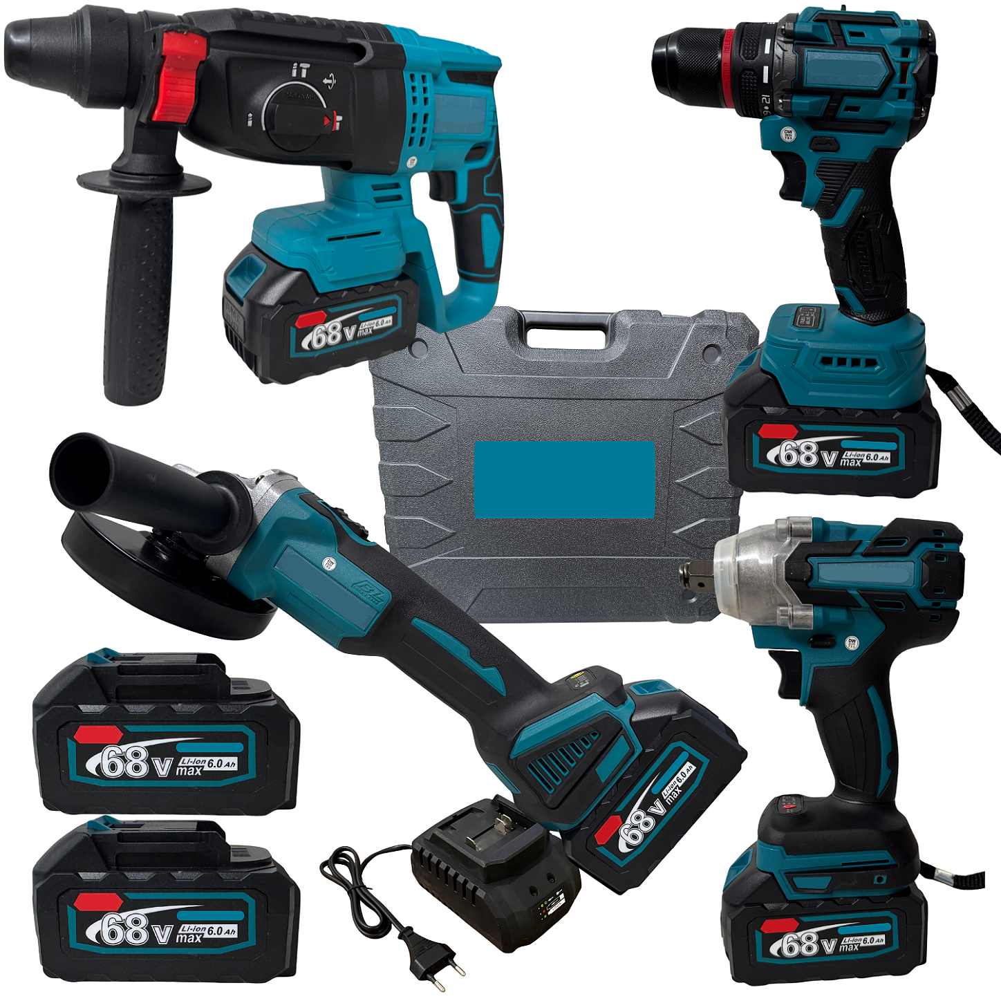O kit conta com furadeira, parafusadeira, serra esmeril e chave de impacto, todas alimentadas por bateria recarregável de 68V. O conjunto proporciona versatilidade com máxima mobilidade, ideal para profissionais e entusiastas de trabalhos manuais que buscam qualidade e desempenho.